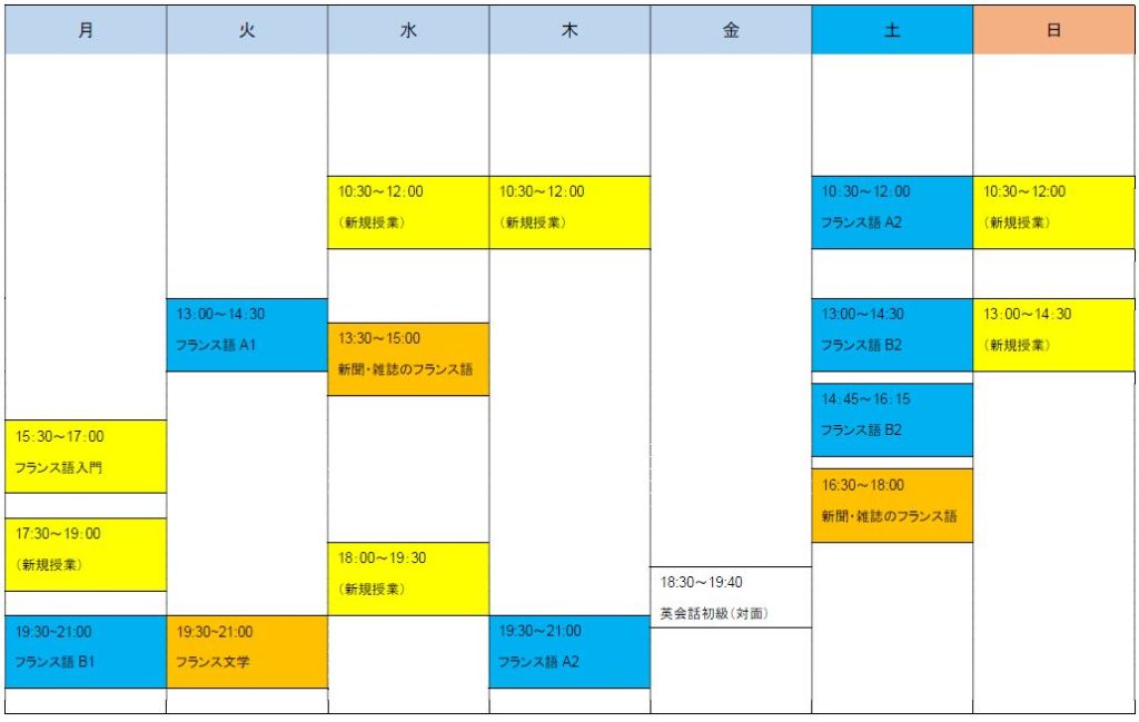 黄色で示している時間で新規授業を開講する予定です。何かご希望があれば遠慮なくご提案ください。