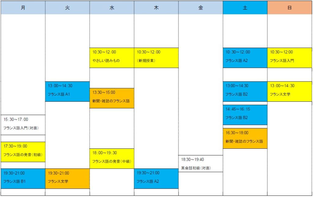 黄色で示している時間で新規授業を開講する予定です。何かご希望があれば遠慮なくご提案ください。